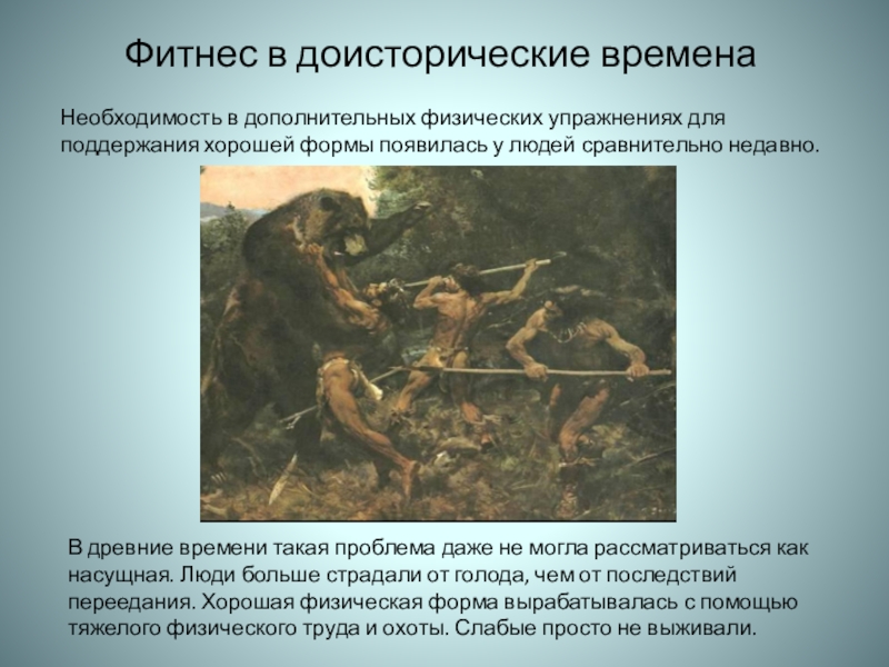 В древние времени такая проблема даже не могла рассматриваться как насущная. Люди больше страдали от голода, чем от последствий переедания. Хорошая физическая форма вырабатывалась с помощью тяжелого физического труда и охоты. Слабые просто не выживали.