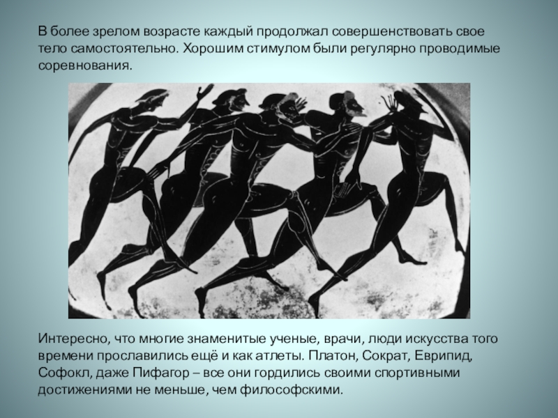 Интересно, что многие знаменитые ученые, врачи, люди искусства того времени прославились ещё и как атлеты. Платон, Сократ, Еврипид, Софокл, даже Пифагор – все они гордились своими спортивными достижениями не меньше, чем философскими.