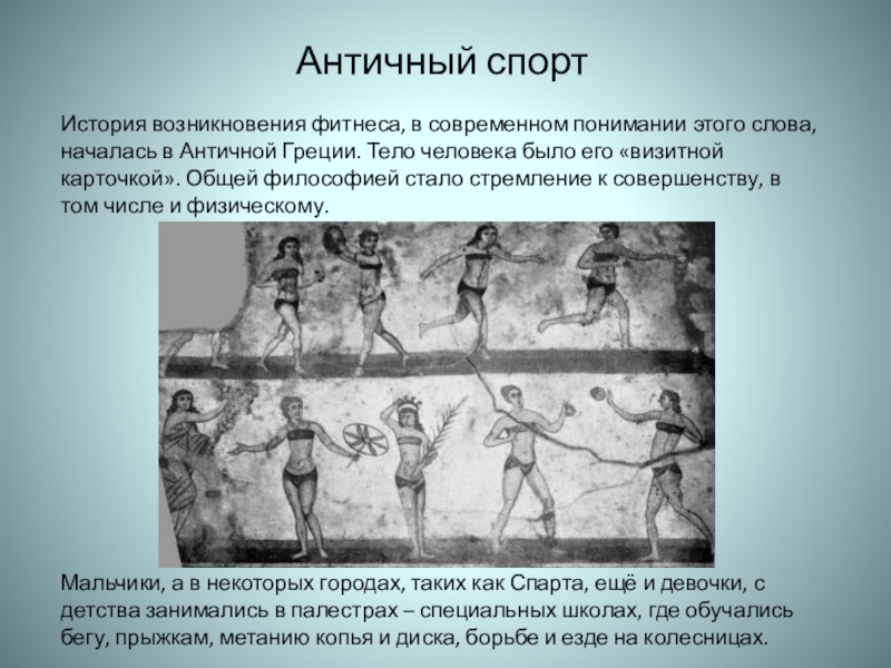 Мальчики, а в некоторых городах, таких как Спарта, ещё и девочки, с детства занимались в палестрах – специальных школах, где обучались бегу, прыжкам, метанию копья и диска, борьбе и езде на колесницах.