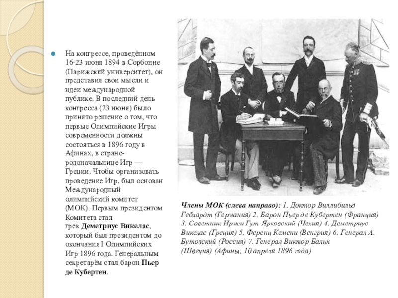 Члены МОК (слева направо): 1. Доктор Виллибильд Гебхардт (Германия) 2. Барон Пьер де Кубертен (Франция) 3. Советник Иржи Гут-Ярковский (Чехия) 4. Деметриус Викелас (Греция) 5. Ференц Кемени (Венгрия) 6. Генерал А.Бутовский (Россия) 7. Генерал Виктор Бальк (Швеция) (Афины, 10 апреля 1896 года)