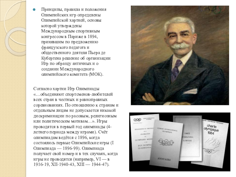 Согласно хартии Игр Олимпиады «…объединяют спортсменов-любителей всех стран в честных и равноправных соревнованиях. По отношению к странам и отдельным лицам не допускается никакой дискриминации по расовым, религиозным или политическим мотивам…». Игры проводятся в первый год олимпиады (4-летнего периода между играми). Счёт олимпиадам ведётся с 1896, когда состоялись первые Олимпийские игры (I Олимпиада — 1896-99). Олимпиада получает свой номер и в тех случаях, когда игры не проводятся (например, VI — в 1916-19, XII-1940-43, XIII — 1944-47).