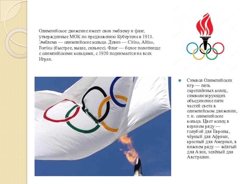 Олимпийское движение имеет свои эмблему и флаг, утвержденные МОК по предложению Кубертена в 1913. Эмблема — олимпийские кольца. Девиз — Citius, Altius, Fortius (быстрее, выше, сильнее). Флаг — белое полотнище с олимпийскими кольцами, с 1920 поднимается на всех Играх.
