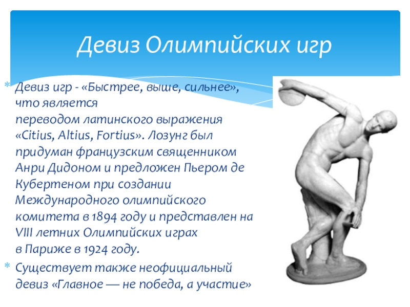 Слайд 10Девиз игр - «Быстрее, выше, сильнее», что является переводом латинского выражения «Citius, Altius,