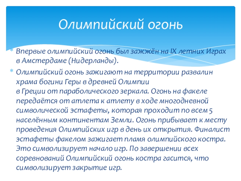 Впервые олимпийский огонь был зажжён на IX летних Играх в Амстердаме (Нидерланды).Олимпийский огонь зажигают на территории развалин