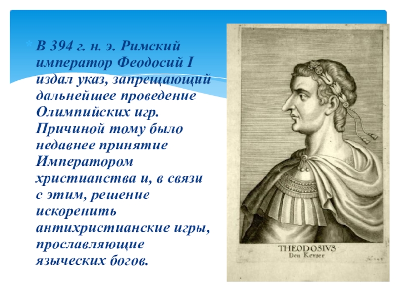 Слайд 7В 394 г. н. э. Римский император Феодосий I издал указ,