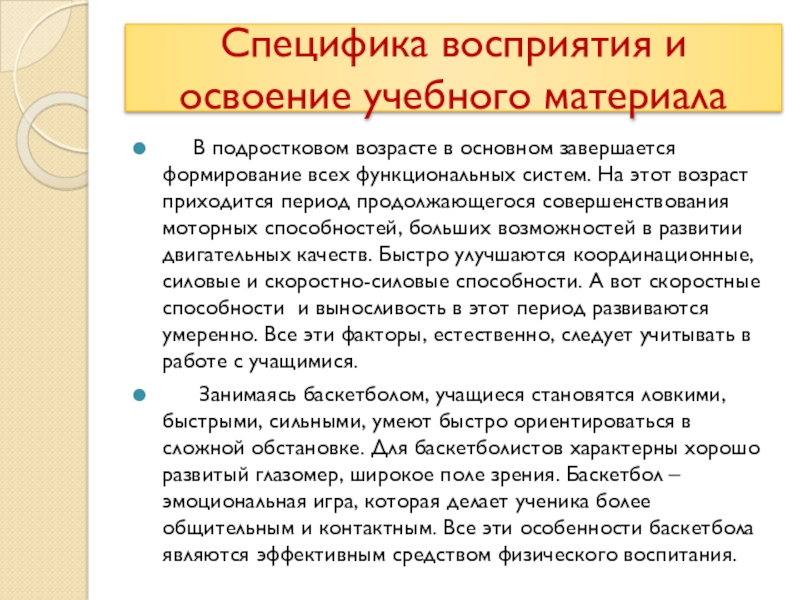 Занимаясь баскетболом, учащиеся становятся ловкими, быстрыми, сильными, умеют быстро ориентироваться в сложной обстановке. Для баскетболистов характерны хорошо развитый глазомер, широкое поле зрения. Баскетбол – эмоциональная игра, которая делает ученика более общительным и контактным. Все эти особенности баскетбола являются эффективным средством физического воспитания.