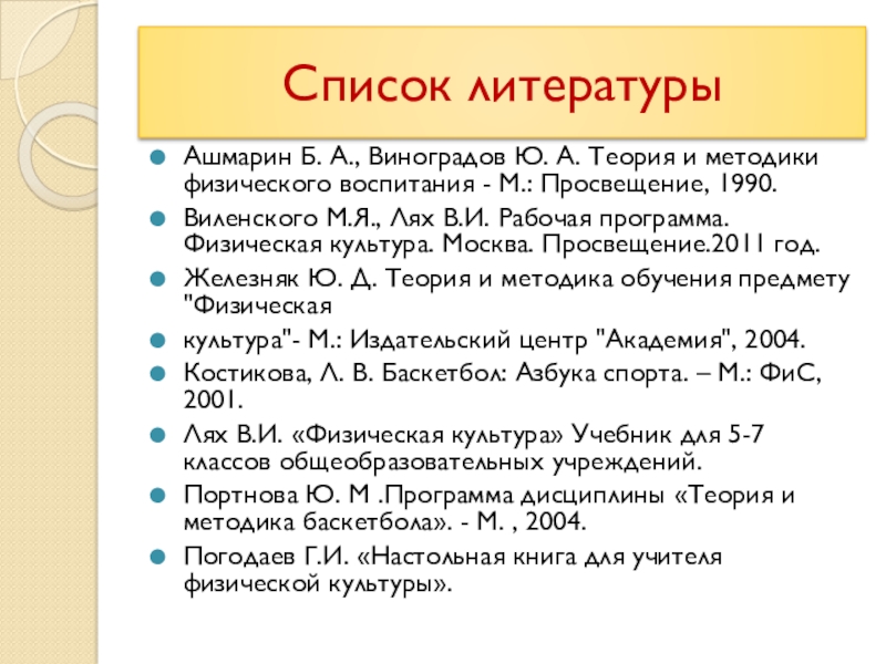 Костикова, Л. В. Баскетбол: Азбука спорта. – М.: ФиС, 2001.