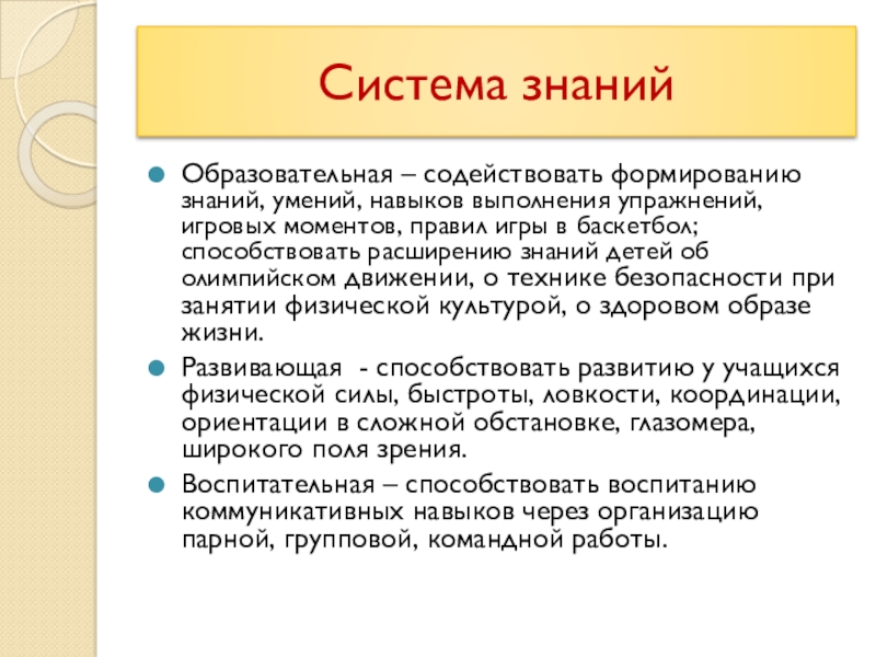 моментов, правил игры в баскетбол; способствовать расширению знаний детей об олимпийском движении, о технике безопасности при занятии физической культурой, о здоровом образе жизни.