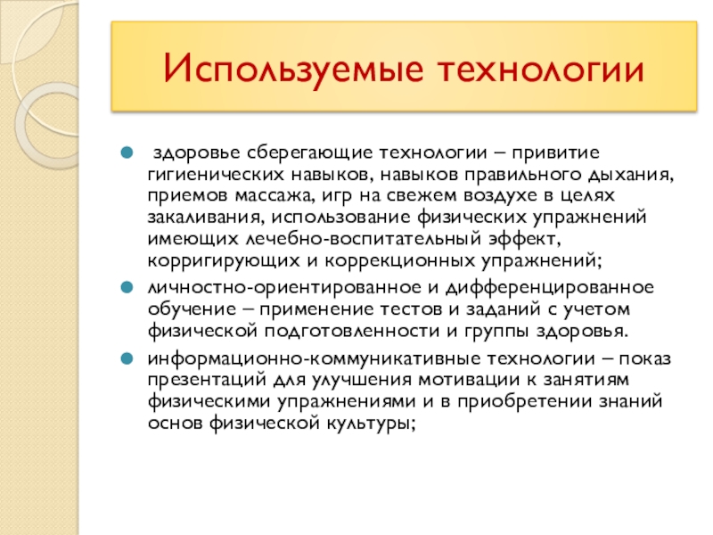 дыхания, приемов массажа, игр на свежем воздухе в целях закаливания, использование физических упражнений имеющих лечебно-воспитательный эффект, корригирующих и коррекционных упражнений;