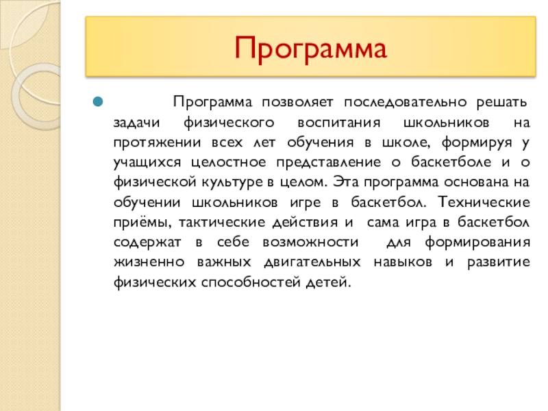 на протяжении всех лет обучения в школе, формируя у учащихся целостное представление о баскетболе и о физической культуре в целом. Эта программа основана на обучении школьников игре в баскетбол. Технические приёмы, тактические действия и сама игра в баскетбол содержат в себе возможности для формирования жизненно важных двигательных навыков и развитие физических способностей детей.