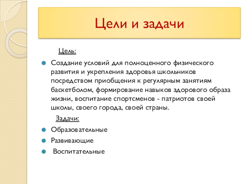 и укрепления здоровья школьников посредством приобщения к регулярным занятиям баскетболом, формирование навыков здорового образа жизни, воспитание спортсменов - патриотов своей школы, своего города, своей страны.