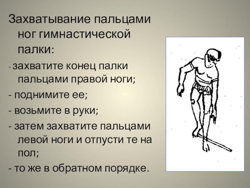Слайд 27Захватывание пальцами ног гимнастической палки:
