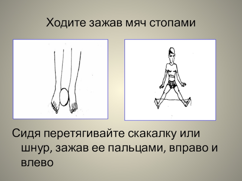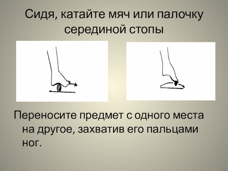 Слайд 24Сидя, катайте мяч или палочку серединой стопы