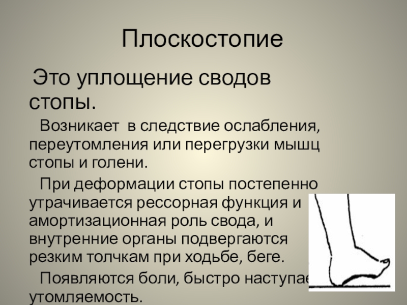 При деформации стопы постепенно утрачивается рессорная функция и амортизационная роль свода, и внутренние органы подвергаются резким толчкам при ходьбе, беге.