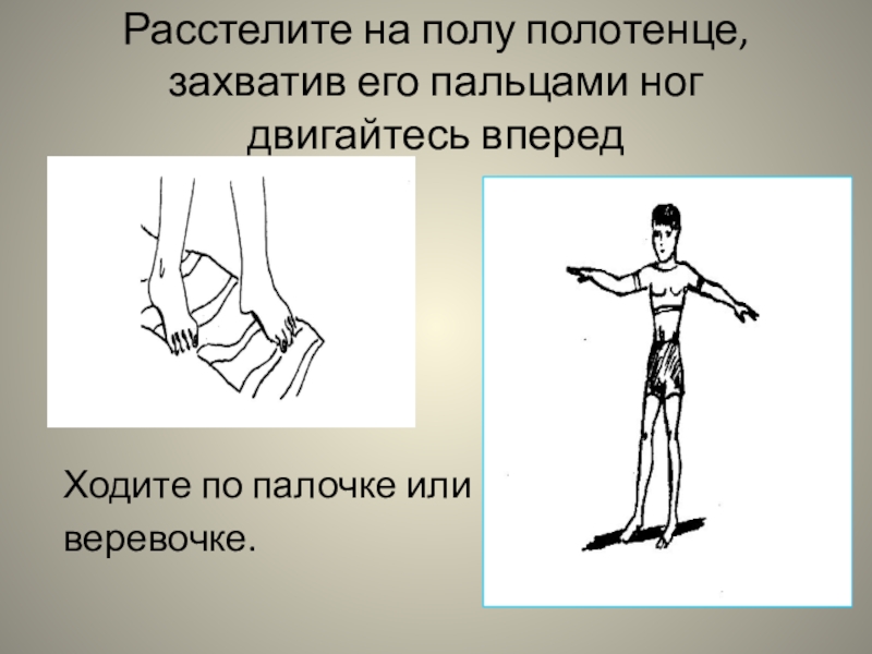 Слайд 25Расстелите на полу полотенце, захватив его пальцами ног двигайтесь вперед