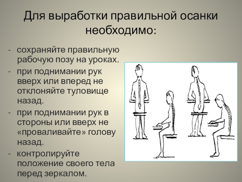 - при поднимании рук вверх или вперед не отклоняйте туловище назад.