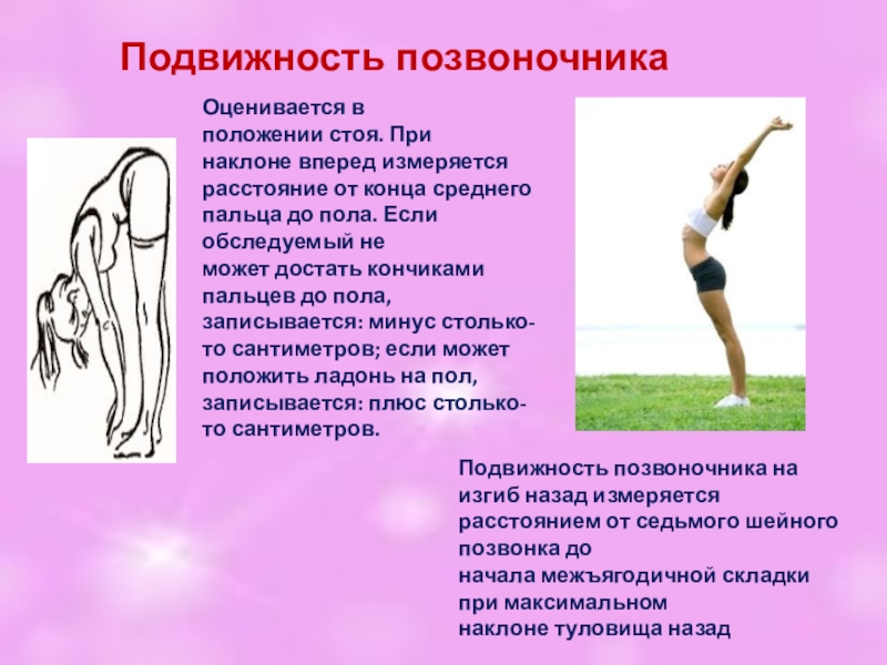 Подвижность позвоночника на изгиб назад измеряется расстоянием от седьмого шейного позвонка до начала межъягодичной складки при максимальном наклоне туловища назад