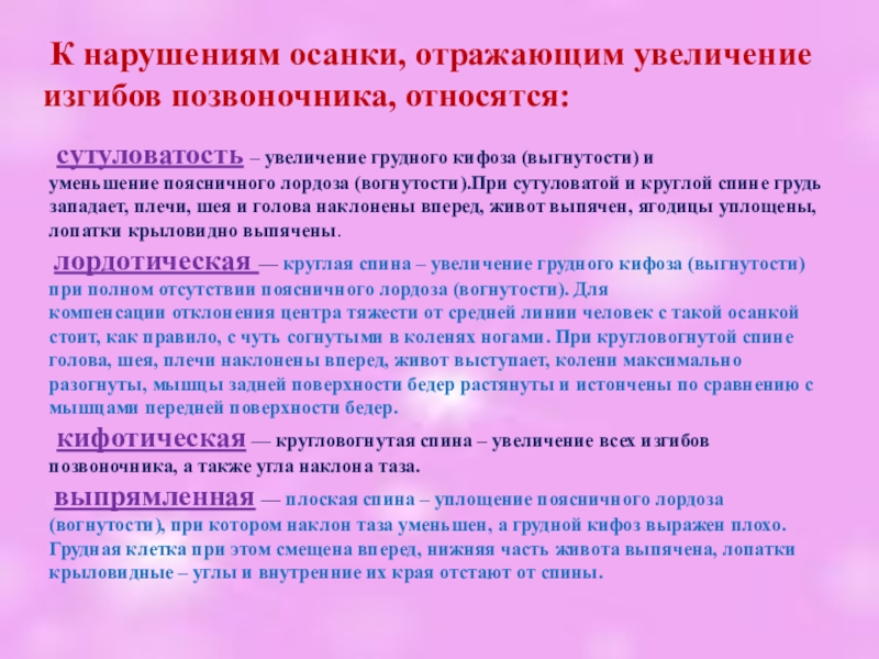 выпрямленная — плоская спина – уплощение поясничного лордоза (вогнутости), при котором наклон таза уменьшен, а грудной кифоз выражен плохо. Грудная клетка при этом смещена вперед, нижняя часть живота выпячена, лопатки крыловидные – углы и внутренние их края отстают от спины.