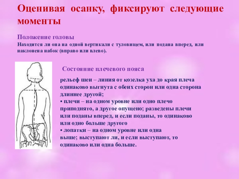 • лопатки – на одном уровне или одна выше; выступают ли, и если выступают, то одинаково или одна больше.