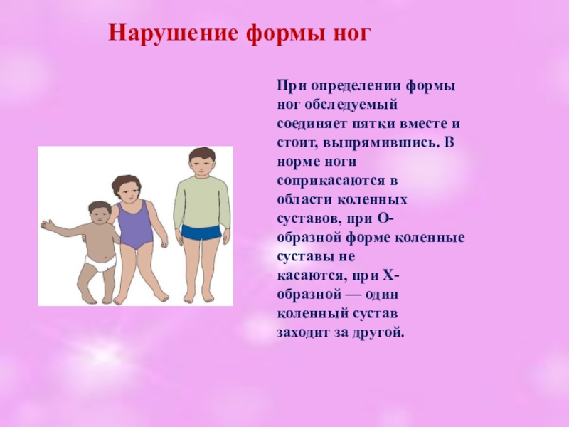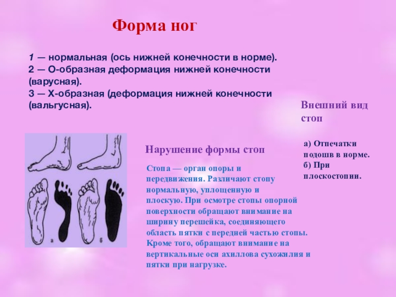 Стопа — орган опоры и передвижения. Различают стопу нормальную, уплощенную и плоскую. При осмотре стопы опорной поверхности обращают внимание на ширину перешейка, соединяющего область пятки с передней частью стопы. Kроме того, обращают внимание на вертикальные оси ахиллова сухожилия и пятки при нагрузке.