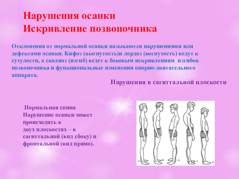 Нарушение осанки может происходить в двух плоскостях – в сагиттальной (вид сбоку) и фронтальной (вид прямо).