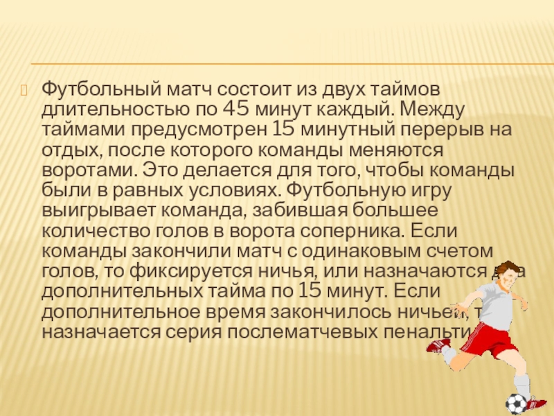 Слайд 5Футбольный матч состоит из двух таймов длительностью по 45 минут каждый.
