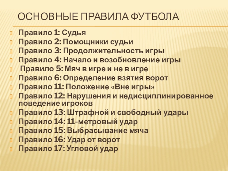 Основные правила футбола  Правило 1: Судья Правило 2: Помощники судьи Правило 3: Продолжительность игры Правило 4: Начало