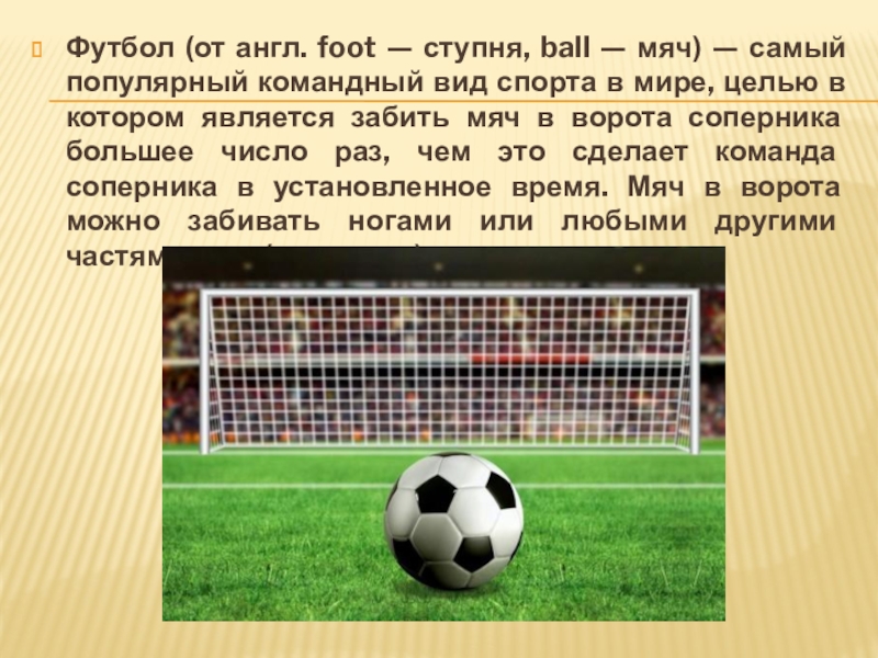 Слайд 2Футбол (от англ. foot — ступня, ball — мяч) — самый