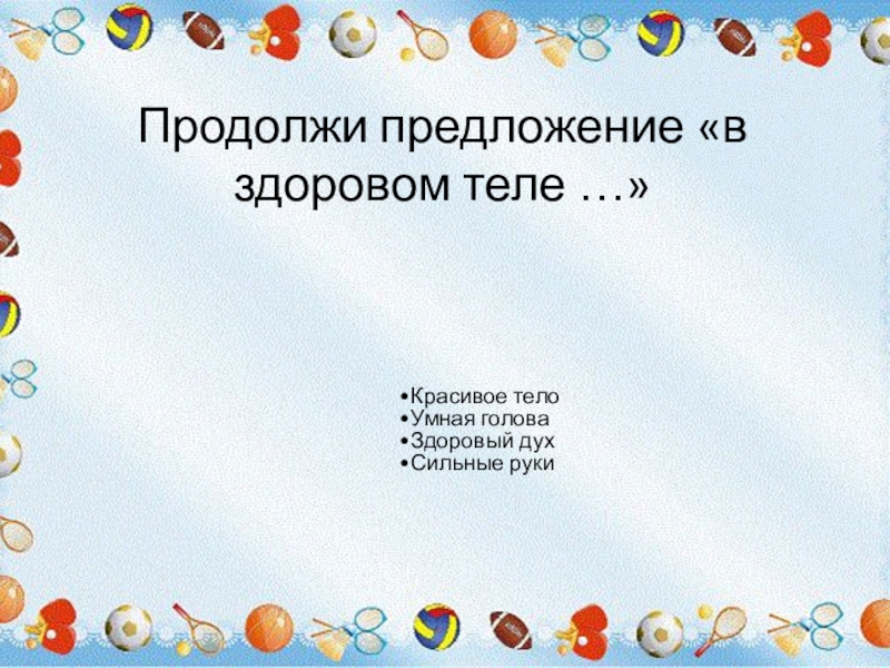 Слайд 2Продолжи предложение «в здоровом теле …»