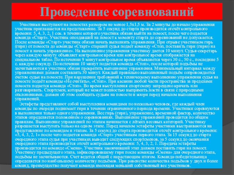 м. За 2 минуты до начало упражнения участник приглашается на представление. За 5 секунд до старта производится отсчёт контрольного времени: 5, 4, 3, 2, 1 сек. в течение которого участник обязан выйти на помост, после чего подается команда «Старт». Участник опоздавший на помост к моменту старта до соревнований не допускается. После команды «Старт» участник обязан начать выполнять упражнения. При отрыве участником гирь (гири) от помоста до команды «Старт» старший судья подает команду «Стоп, поставить гири (гирю) на помост и начать упражнение». На выполнение упражнения участнику дается 10 минут. Судья-секретарь через каждую минуту объявляет контрольное время или контрольное время отображается на специальном табло. По истечении 9 минут контрольное время объявляется через 30 с., 50 с., последние 5 с. каждую секунду. По истечении 10 минут подается команда «Стоп», после которой подъёмы не засчитываются и участник обязан прекратить выполнение упражнения. Минимальный интервал между упражнениями должен составлять 30 минут. Каждый правильно выполненный подъём сопровождается счетом судьи на помосте. При нарушении требований к техническому выполнению упражнения судья на помосте подаёт команды «Не считать», «Стоп». При касании любой части пространства за пределами помоста подается команда «Стоп». Во время выступления спортсмену запрещено кричать или разговаривать. Спортсмен, который не может полностью выпрямить локти в связи с природными отклонениями, должен об этом сообщить судьям на помосте и жюри перед началом выполнения упражнений.