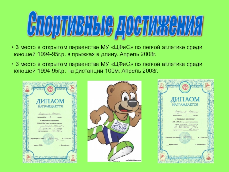 3 место в открытом первенстве МУ «ЦФиС» по легкой атлетике среди юношей 1994-95г.р. на дистанции 100м. Апрель 2008г.