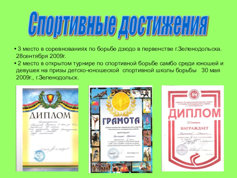 2 место в турнире «Открытый ковер» по греко-римской борьбе, посвященном 9 мая, среди юношей. 3 мая 2009года, г.Казань.
