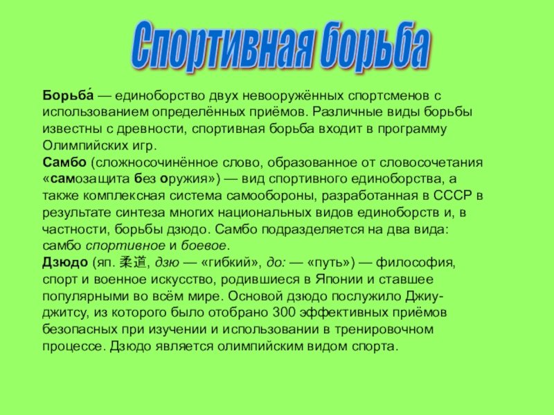 Борьба́ — единоборство двух невооружённых спортсменов с использованием определённых приёмов.