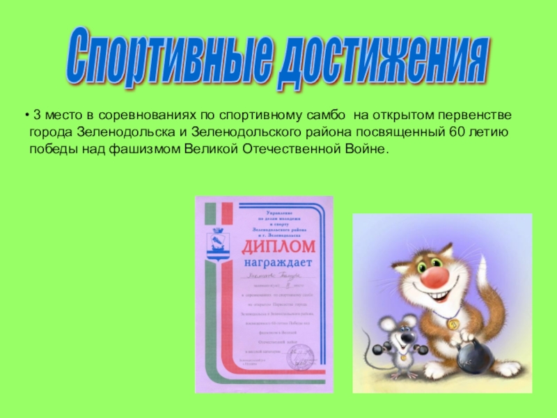 1 место в 8 Всероссийском турнире по борьбе самбо, посвященном 225-летию основания г.Чистополя на призы главы Чистопольского муниципального района. 2008г,г.Чистополь