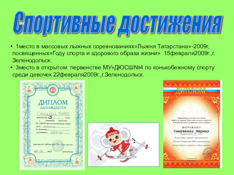 1место в массовых лыжных соревнованиях»Лыжня Татарстана»-2009г,посвященных»Году спорта и