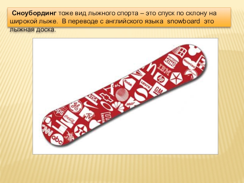 на широкой лыже. В переводе с английского языка snowboard это лыжная доска.