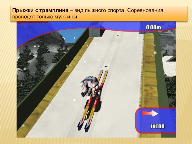 Слайд 15Прыжки с трамплина – вид лыжного спорта. Соревнования проводят только мужчины.