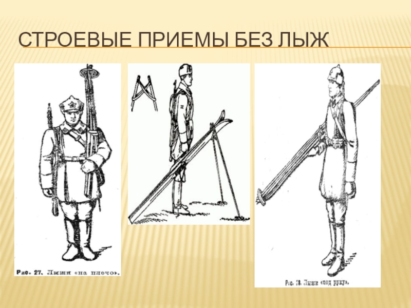 Для того чтобы взять лыжи, подается команда «Лыжи - ВЗЯТЬ!». По этой команде, сделав шаг левой ногой, взять лыжи и принять строевую стойку с лыжами.
