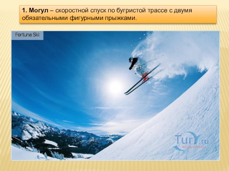 Слайд 211. Могул – скоростной спуск по бугристой трассе с двумя обязательными