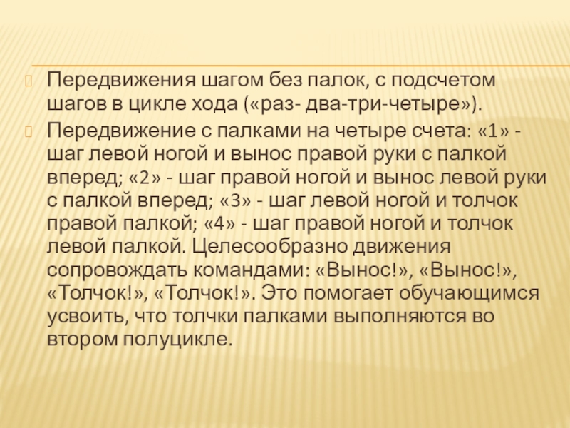 Передвижение с палками на четыре счета: «1» - шаг левой ногой и вынос правой руки с палкой вперед; «2» - шаг правой ногой и вынос левой руки с палкой вперед; «3» - шаг левой ногой и толчок правой палкой; «4» - шаг правой ногой и толчок левой палкой. Целесообразно движения сопровождать командами: «Вынос!», «Вынос!», «Толчок!», «Толчок!». Это помогает обучающимся усвоить, что толчки палками выполняются во втором полуцикле.