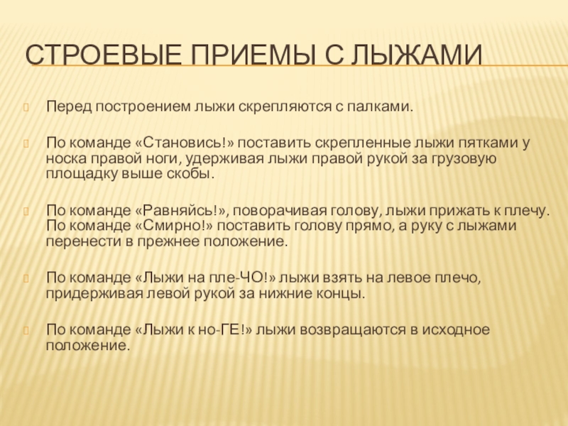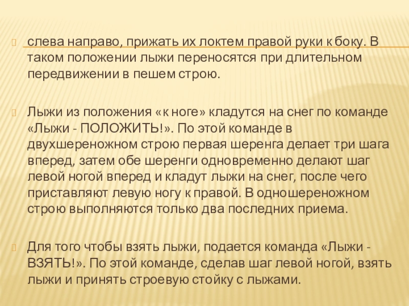 По команде «Лыжи на пле-ЧО!» лыжи взять на левое плечо, придерживая левой рукой за нижние концы.