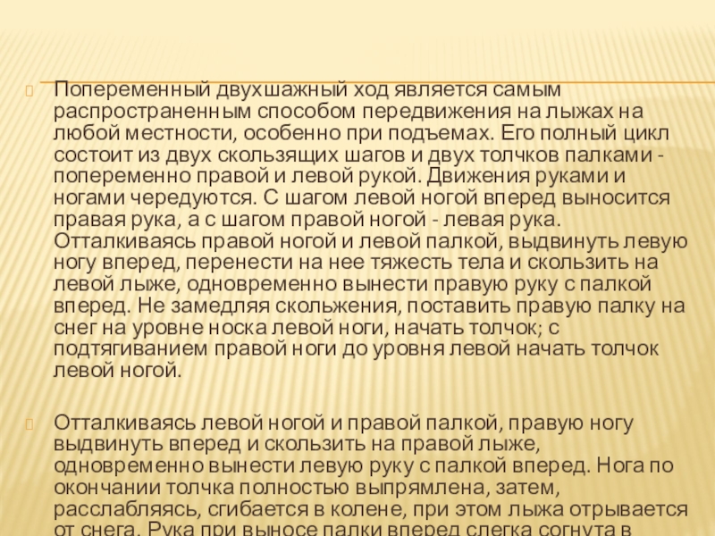 любой местности, особенно при подъемах. Его полный цикл состоит из двух скользящих шагов и двух толчков палками - попеременно правой и левой рукой. Движения руками и ногами чередуются. С шагом левой ногой вперед выносится правая рука, а с шагом правой ногой - левая рука. Отталкиваясь правой ногой и левой палкой, выдвинуть левую ногу вперед, перенести на нее тяжесть тела и скользить на левой лыже, одновременно вынести правую руку с палкой вперед. Не замедляя скольжения, поставить правую палку на снег на уровне носка левой ноги, начать толчок; с подтягиванием правой ноги до уровня левой начать толчок левой ногой.
