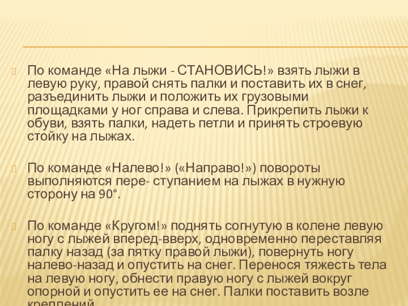 По команде «Налево!» («Направо!») повороты выполняются пере- ступанием на лыжах в нужную сторону на 90°.