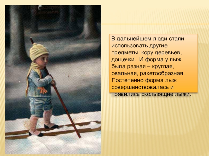 форма у лыж была разная – круглая, овальная, ракетообразная. Постепенно форма лыж совершенствовалась и появились скользящие лыжи.