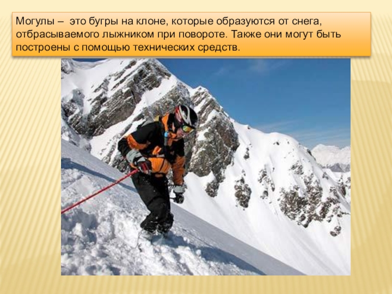 Слайд 22Могулы – это бугры на клоне, которые образуются от снега, отбрасываемого