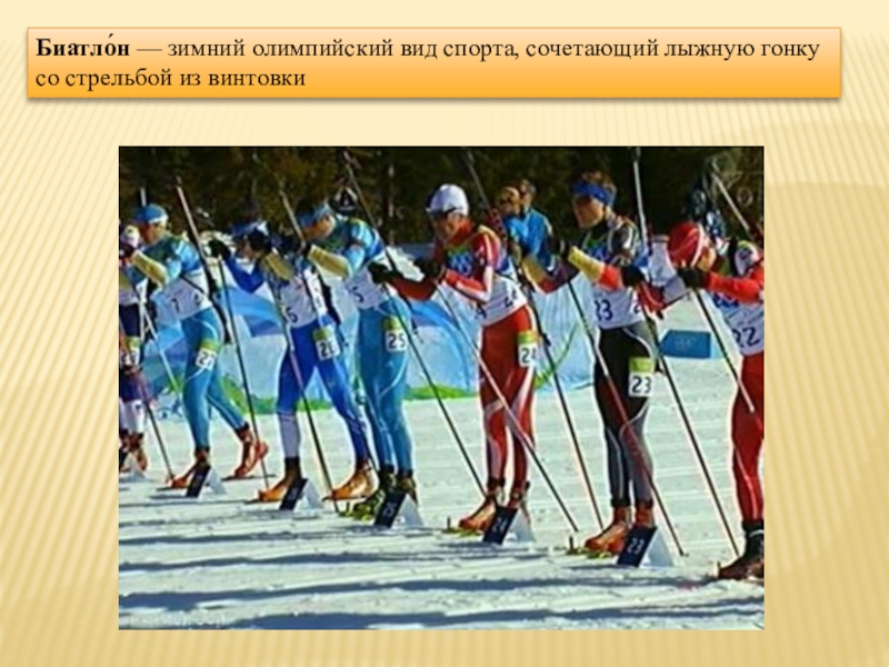 Слайд 26Биатло́н — зимний олимпийский вид спорта, сочетающий лыжную гонку со стрельбой