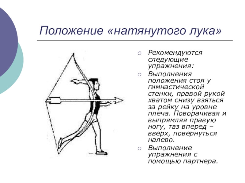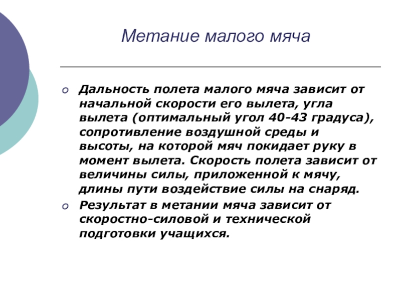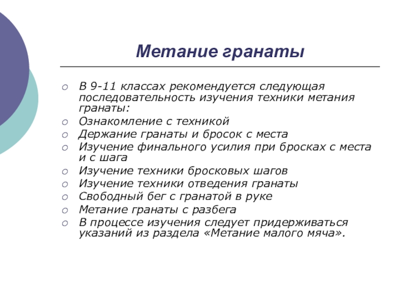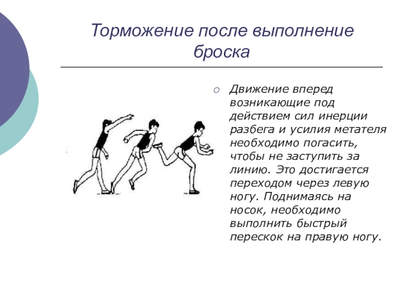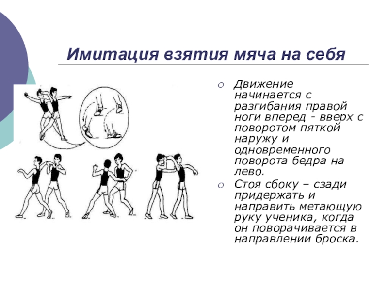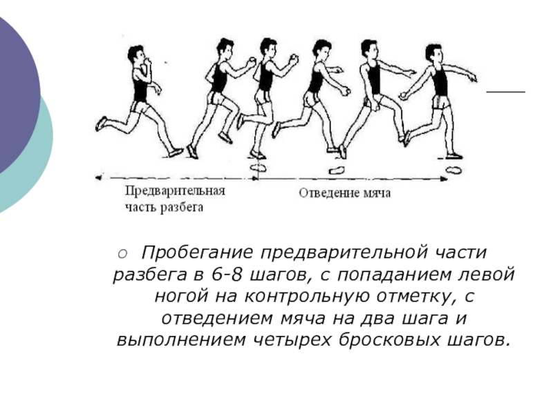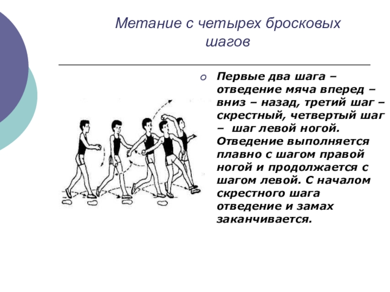 Выпрямленная рука отведена назад на уровне плеча вес тела на правой ноге, согнутой в колене (положение замаха). Бросок начинается с вращательно - разгибательного движения правой ноги продолжается продвижением туловища вперед - вверх заканчивается хлестким движение предплечья и кисти.