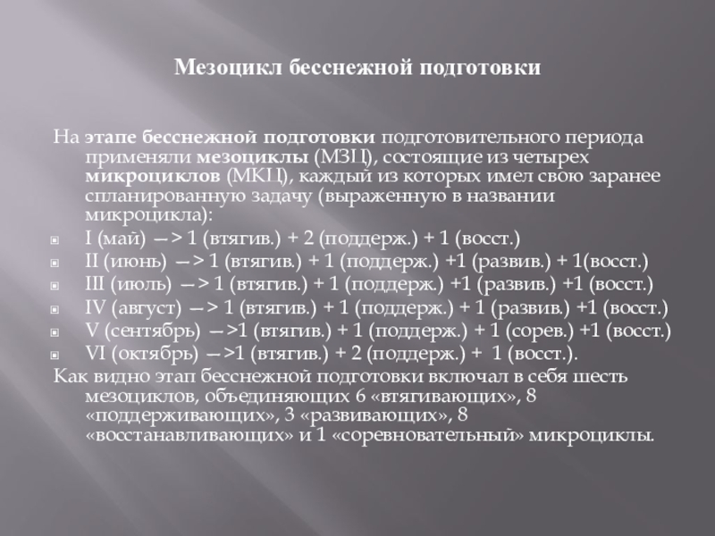 На этапе бесснежной подготовки подготовительного периода применяли мезоциклы (МЗЦ),