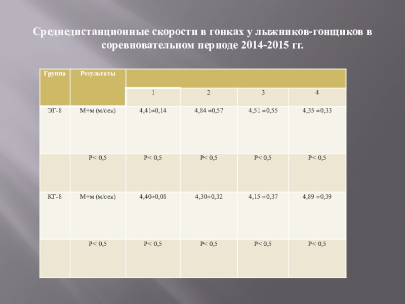 Слайд 18Среднедистанционные скорости в гонках у лыжников-гонщиков в соревновательном периоде 2014-2015 гг.