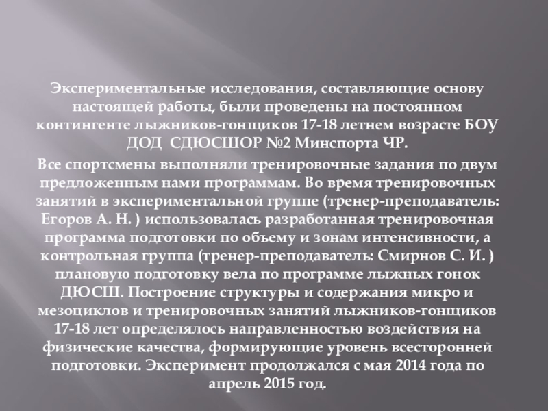 Все спортсмены выполняли тренировочные задания по двум предложенным нами программам. Во время тренировочных занятий в экспериментальной группе (тренер-преподаватель: Егоров А. Н. ) использовалась разработанная тренировочная программа подготовки по объему и зонам интенсивности, а контрольная группа (тренер-преподаватель: Смирнов С. И. ) плановую подготовку вела по программе лыжных гонок ДЮСШ. Построение структуры и содержания микро и мезоциклов и тренировочных занятий лыжников-гонщиков 17-18 лет определялось направленностью воздействия на физические качества, формирующие уровень всесторонней подготовки. Эксперимент продолжался с мая 2014 года по апрель 2015 год.